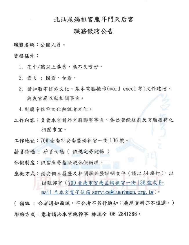 應徵方式:備妥個人履歷及相關學經歷證明文件(請以A4繕打),以掛號郵寄(709臺南市安南區媽祖宮一街136號或E-mail至本宮電子信箱service@luerhmen.org.tw)。