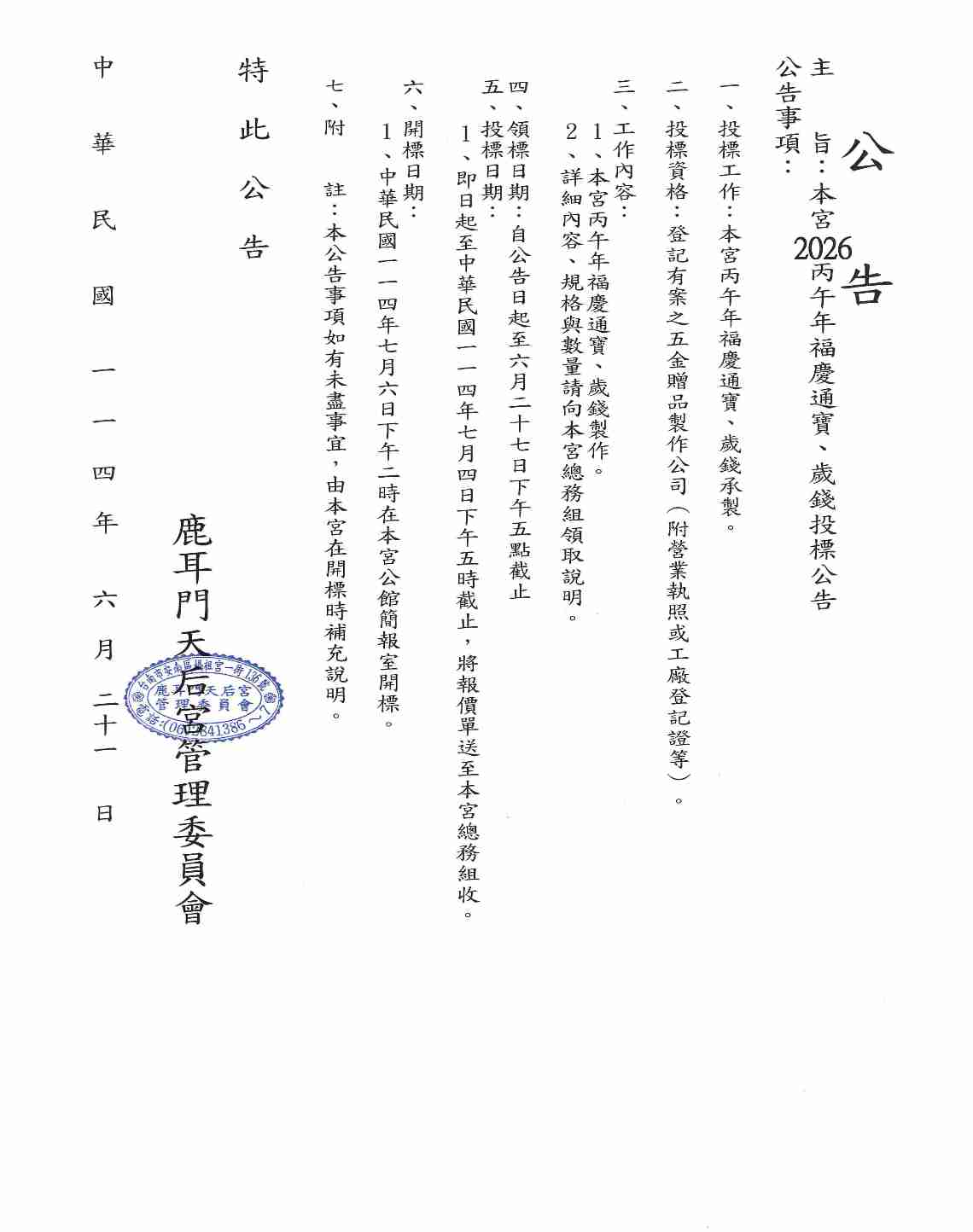2026(丙午)年-福慶通寶、歲錢投標公告